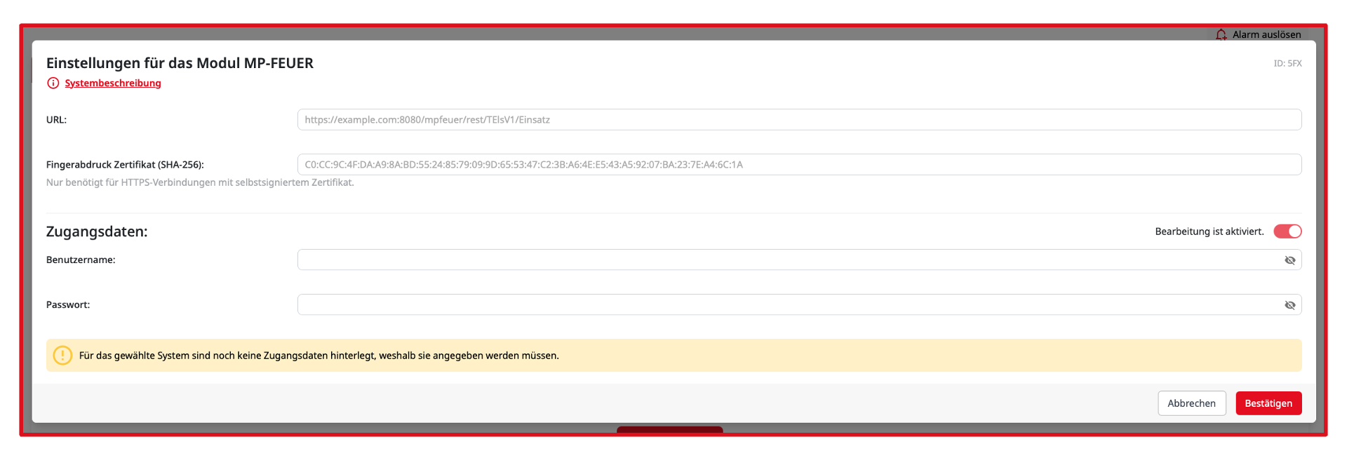 Eine spätere Änderung der Anmeldedaten ist für Administratoren der Leitstellen und Landkreise möglich, sobald die Bearbeitung aktiviert wird. Das auslesen von Daten ist nicht möglich, diese müssen vollständig neu hinterlegt werden.