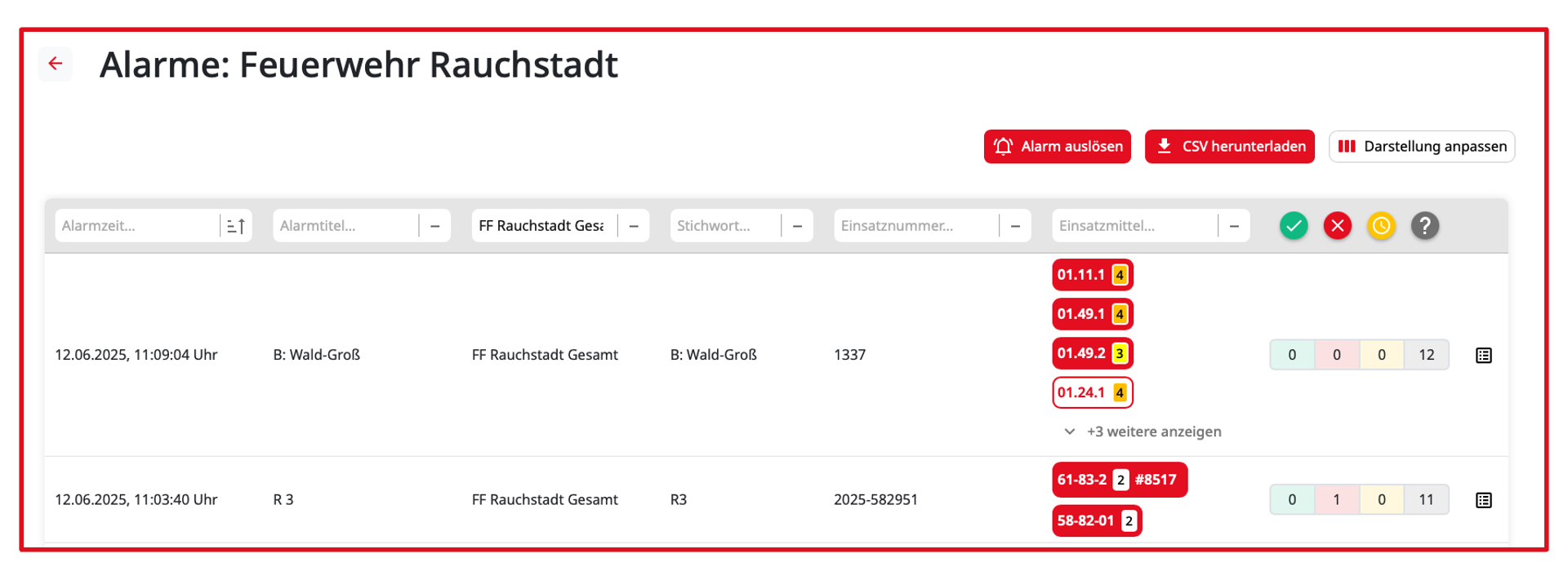 Das auslösen eines Alarmes für eine oder mehrere Alarmgruppen einer Organisation ist über den Button Alarme möglich.