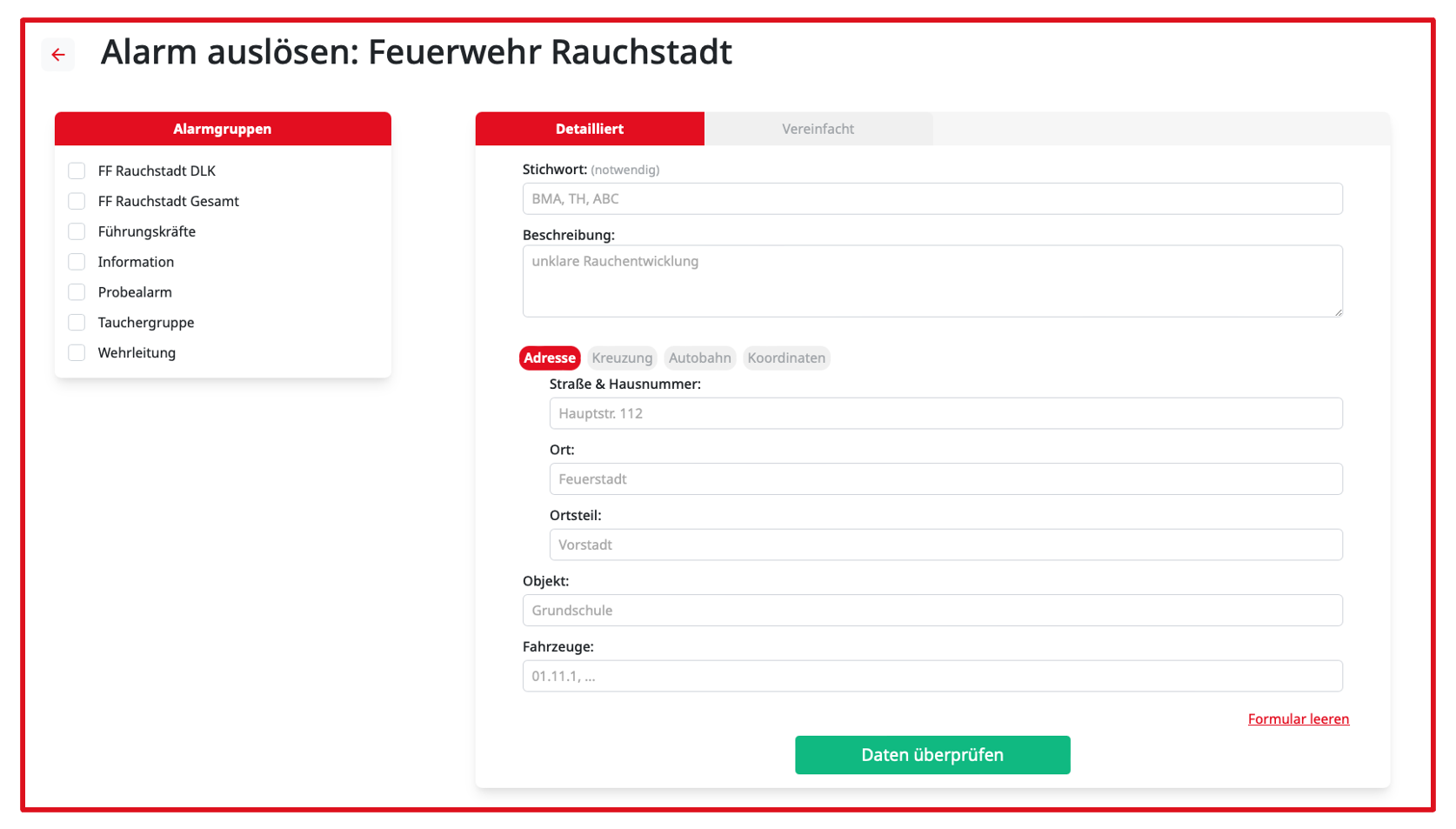 Über den Button Alarm auslösen öffnet sich die Eingabemaske zur Erstellung einer Alarmierung.