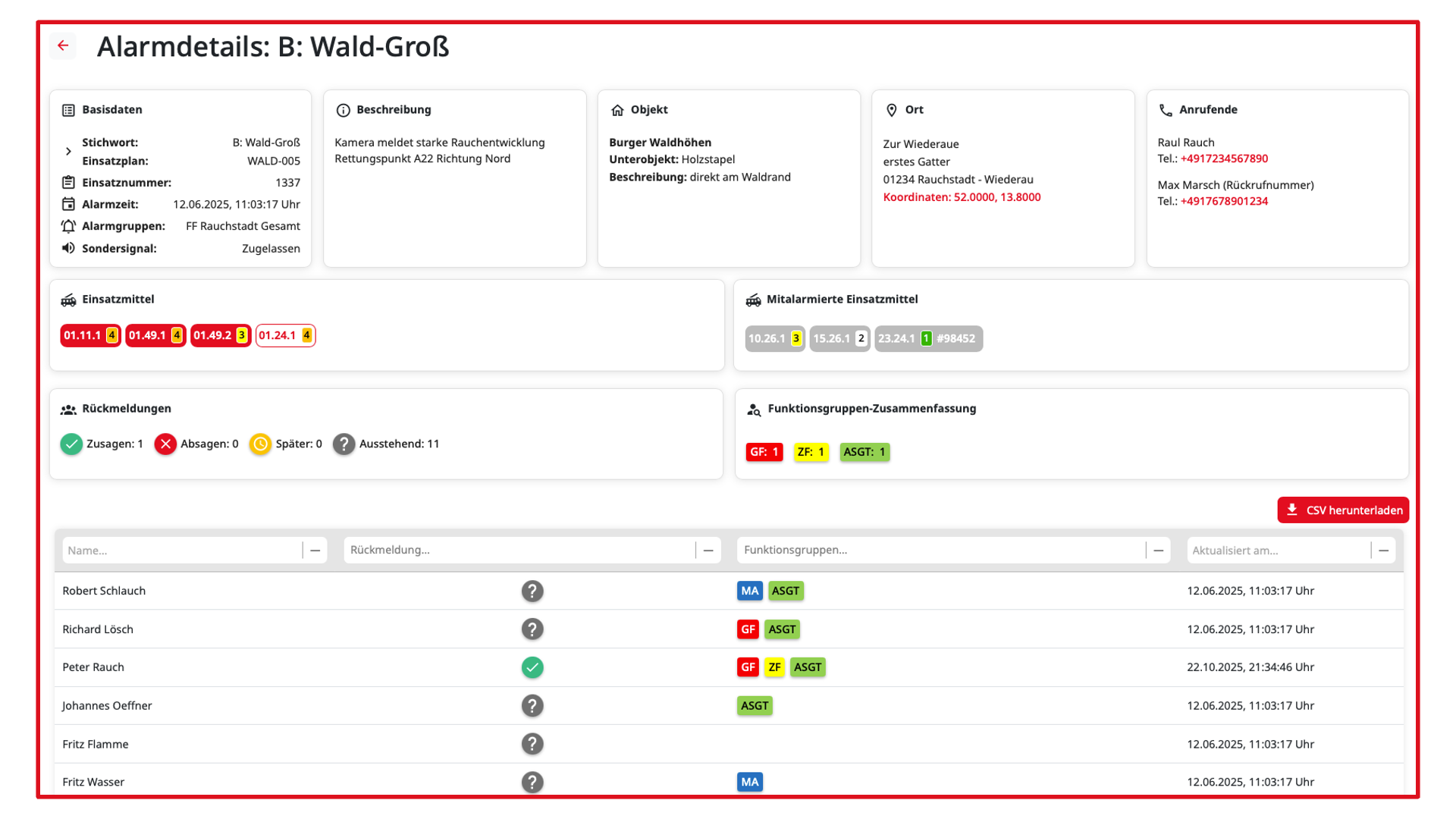 Achtung: Die Darstellung der Inhalte ist abhängig von den Nutzerrechten Alarmdetails und Rückmeldestatus. Je nach Freigabe werden die Daten entsprechend aufgeführt.