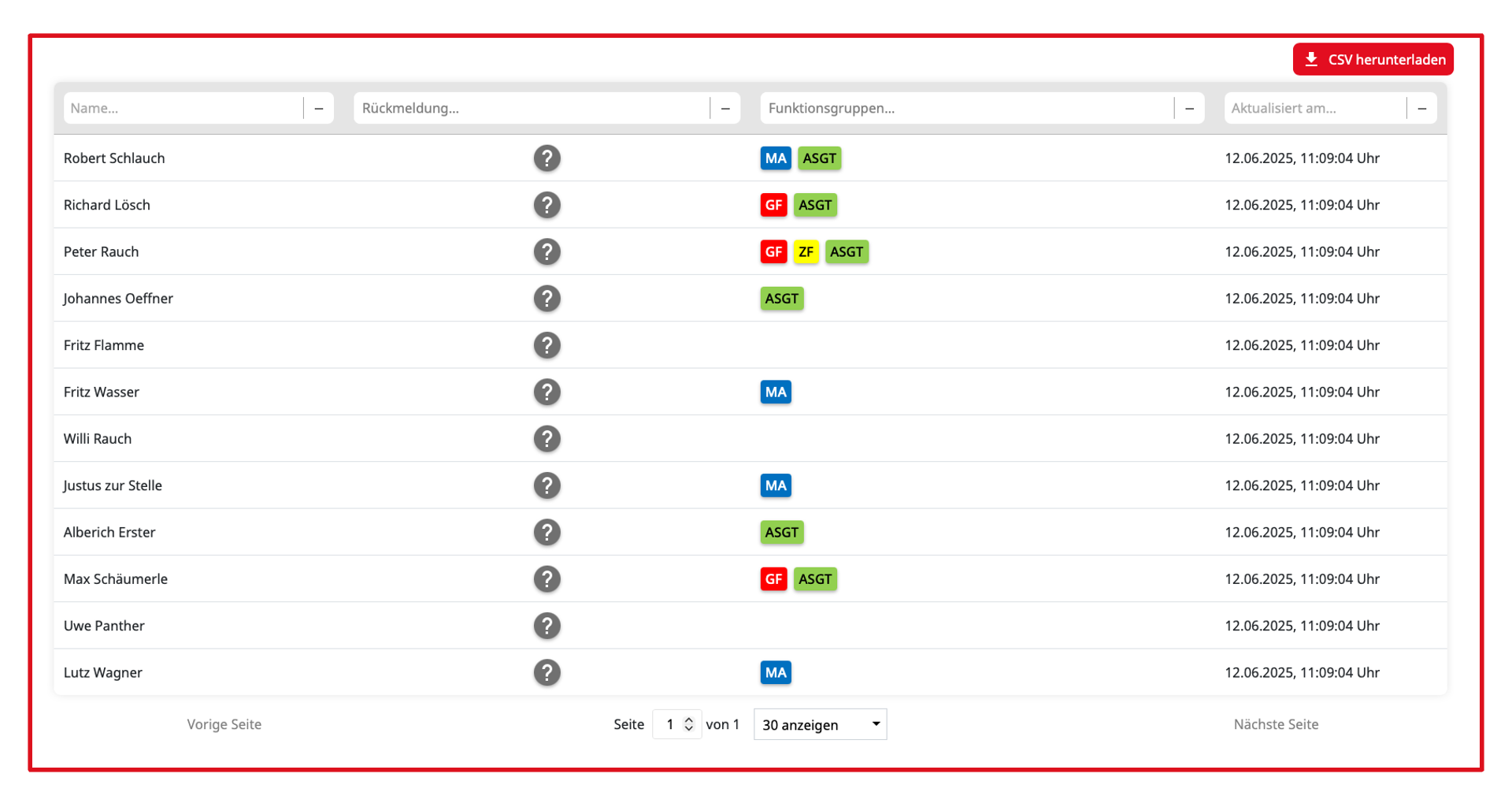 Unterhalb der Alarmdetails können die Rückmeldungen zu dieser Alarmierung eingesehen werden. In der Titelzeile der Tabelle können entsprechende Filter aktiviert werden um die Tabelle auf die Anforderungen des Nutzers anzupassen.